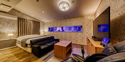 ホテルルナモダン桜ノ宮は、セレブリティ漂う時間をお過ごしいただくために モダンでラグジュアリーな異空間をご用意いたしました。 アクアリウム(水槽)&天蓋ベッドがムードを漂わせます。 どうぞ、心ゆくまで、ご堪能くださいませ。