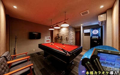 無料で利用できるダーツ&ビリヤード場をホテル地下スペースに設置しました。本格カラオケ機種も新導入!